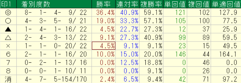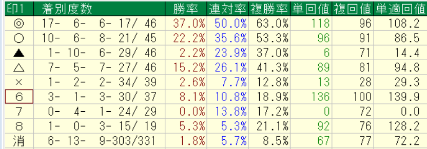 この週は消しにしてしまった大穴馬も何頭か来てしまいましたが、それでも消しの回収率は低いものですし、複勝率も10%を切っていますね。
